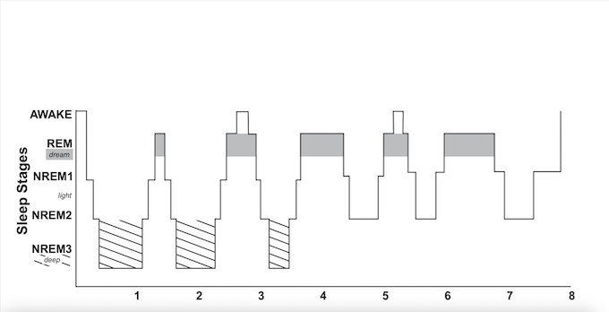 During the night we move in and out of sleep stages in approximately 60-90 minute cycles, interspersed with waking. (as below, table cited from CRUFAD). The first sleep cycles each night feature more deep sleep, in response to homeostatic drive build-up during the day, and less REM (dream) sleep. As the night progresses, time spent in deep (slow-wave) sleep decreases as REM sleep periods increase. By morning, people will more likely wake from light sleep or REM sleep.